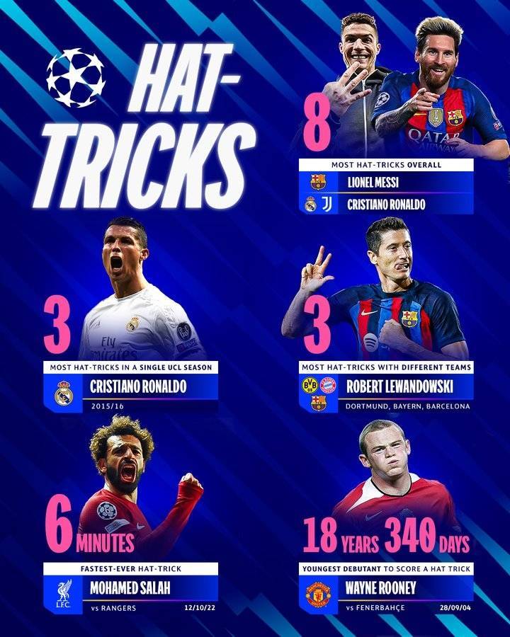 欧冠戴帽各项纪录:梅罗8次并列最多、莱万、萨拉赫、鲁尼上榜